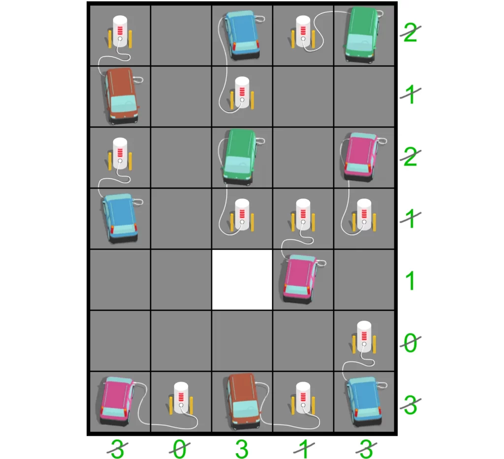 If you make a mistake by placing cars too close, the game will give you a collision alert, allowing you to correct it. The challenge is complete once every charger is connected to a car and the grid is correctly filled with cars and blanks.