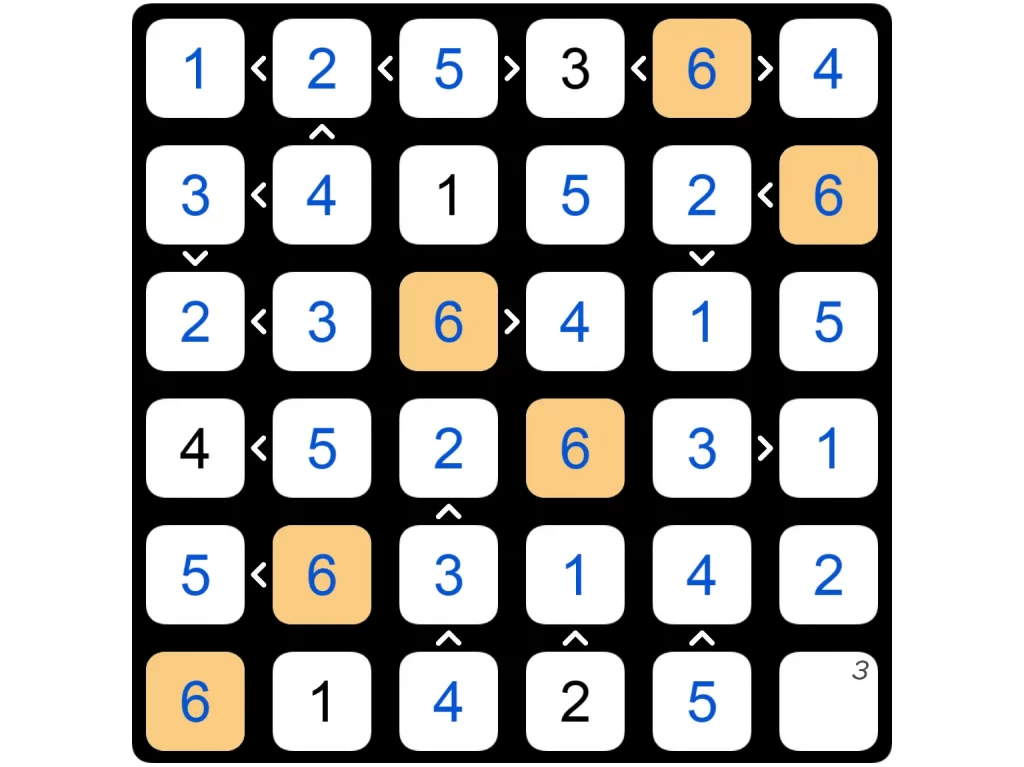 The purpose of Futoshiki is to discover the digits hidden inside the board’s cells; each cell is filled with a digit between 1 and the board’s size. On each row and column, each digit appears just once; therefore, when revealed, the digits of the board form a so-called Latin square.
