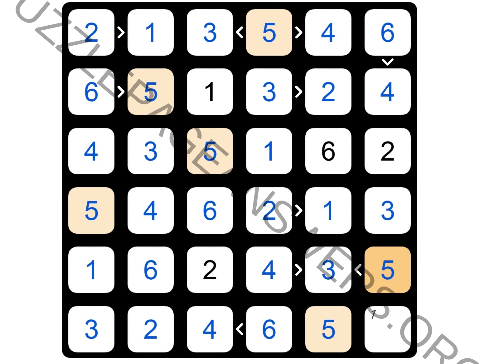 The purpose of Futoshiki is to discover the digits hidden inside the board’s cells; each cell is filled with a digit between 1 and the board’s size. On each row and column each digit appears just once; therefore, when revealed, the digits of the board form a so-called Latin square.