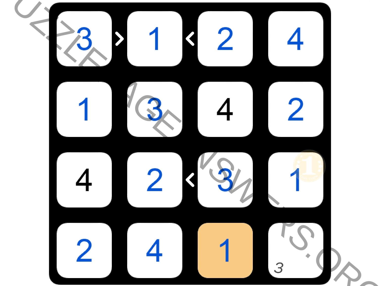 The purpose of Futoshiki is to discover the digits hidden inside the board’s cells; each cell is filled with a digit between 1 and the board’s size. On each row and column each digit appears just once; therefore, when revealed, the digits of the board form a so-called Latin square.