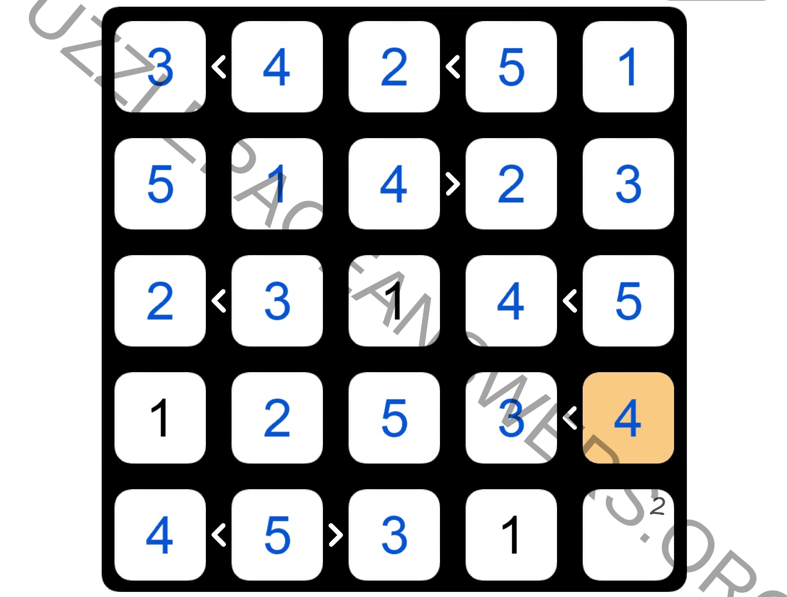 The purpose of Futoshiki is to discover the digits hidden inside the board’s cells; each cell is filled with a digit between 1 and the board’s size. On each row and column each digit appears just once; therefore, when revealed, the digits of the board form a so-called Latin square.