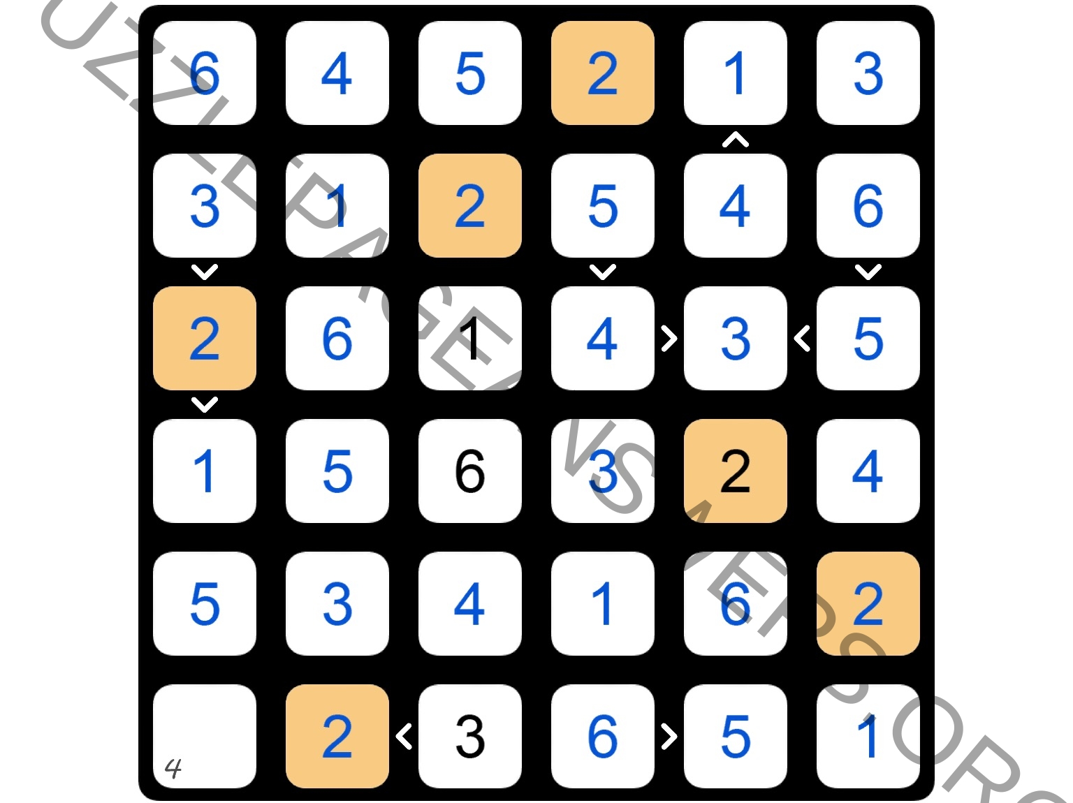 The purpose of Futoshiki is to discover the digits hidden inside the board’s cells; each cell is filled with a digit between 1 and the board’s size. On each row and column each digit appears just once; therefore, when revealed, the digits of the board form a so-called Latin square.