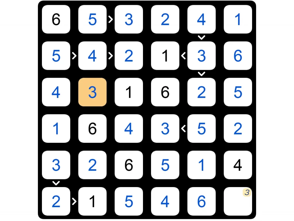 The purpose of Futoshiki is to discover the digits hidden inside the board’s cells; each cell is filled with a digit between 1 and the board’s size. On each row and column, each digit appears just once; therefore, when revealed, the digits of the board form a so-called Latin square.
