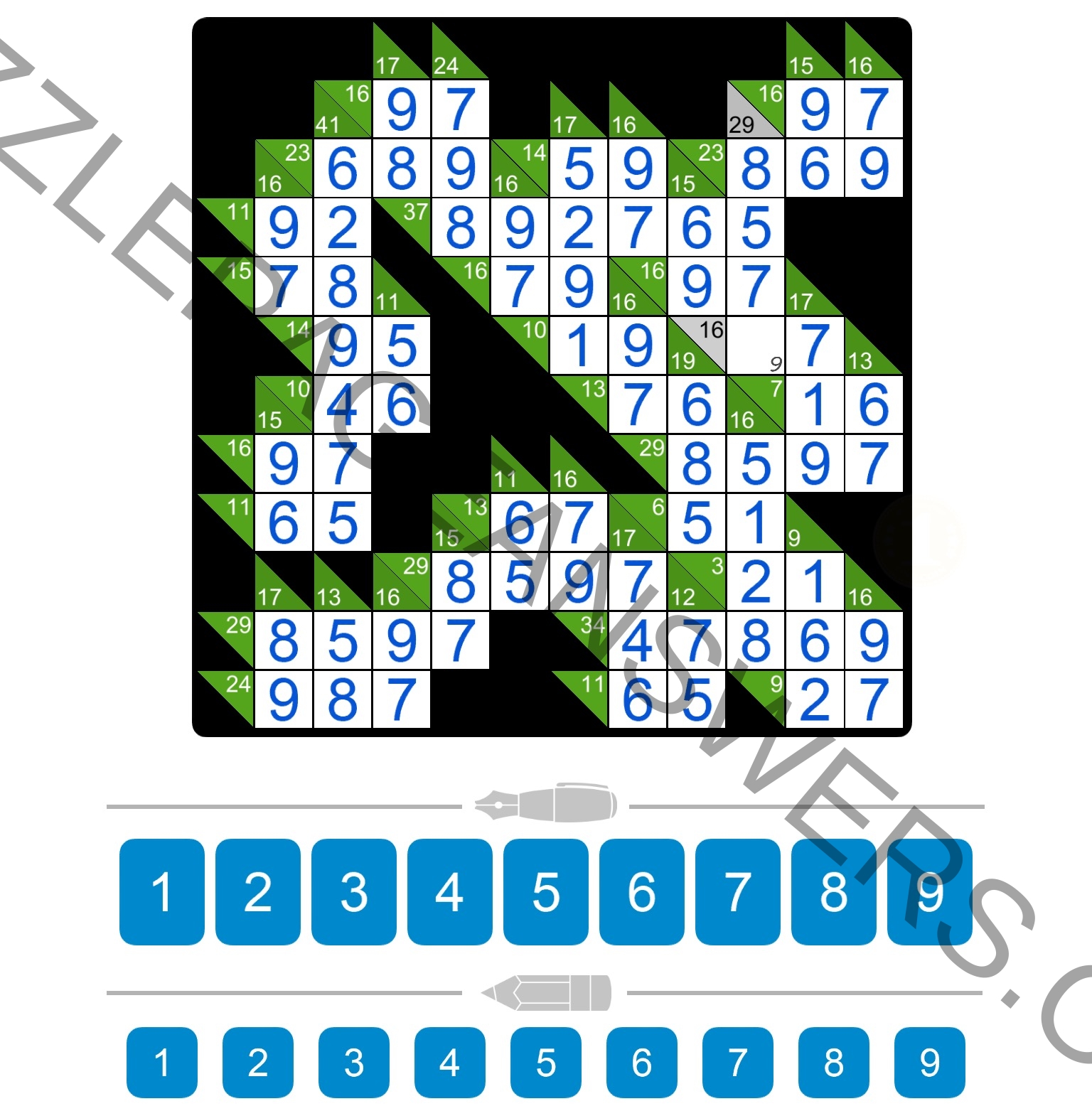 The task in Kakuro puzzles is to fill all the empty squares by using numbers from 1 to 9 so the sum of each horizontal block equals the clue on its left, and the sum of each vertical block equals the clue on its top. In addition, no number may be used in the same block more than once.