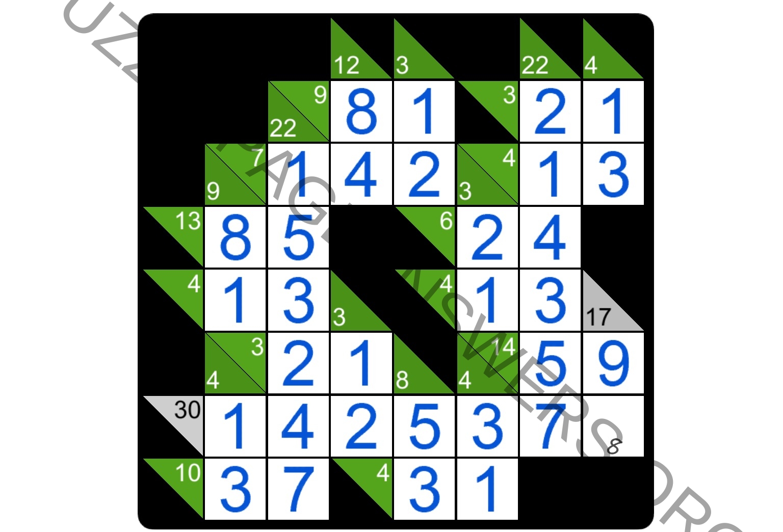 The task in Kakuro puzzles is to fill all the empty squares by using numbers from 1 to 9 so the sum of each horizontal block equals the clue on its left, and the sum of each vertical block equals the clue on its top. In addition, no number may be used in the same block more than once.