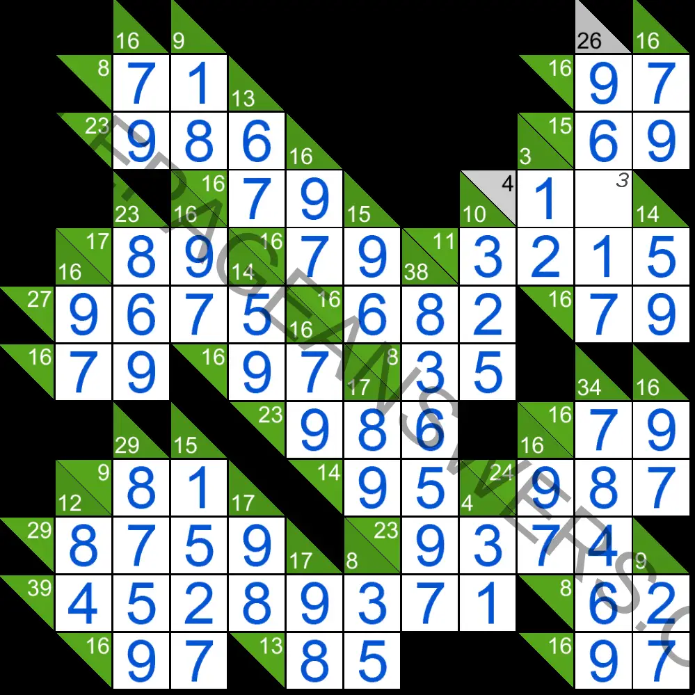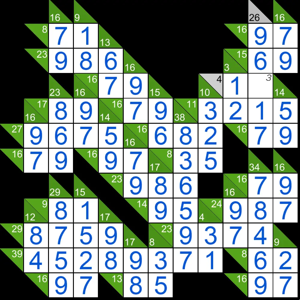 The task in Kakuro puzzles is to fill all the empty squares by using numbers from 1 to 9 so the sum of each horizontal block equals the clue on its left, and the sum of each vertical block equals the clue on its top. In addition, no number may be used in the same block more than once.