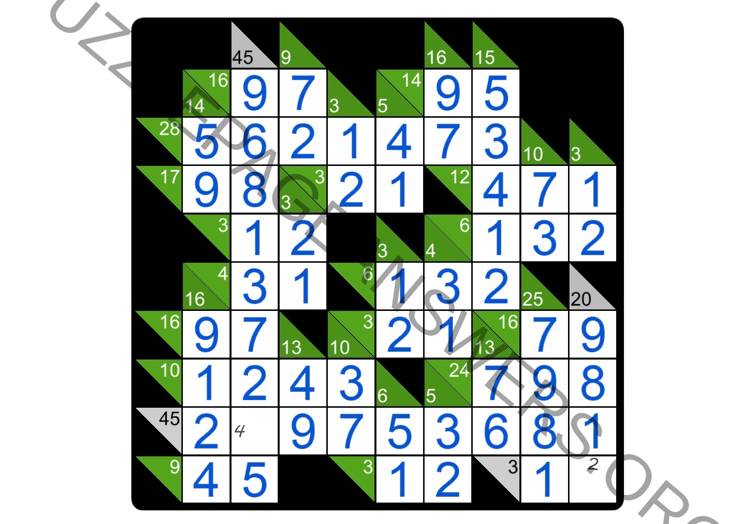 The task in Kakuro puzzles is to fill all the empty squares by using numbers from 1 to 9 so the sum of each horizontal block equals the clue on its left, and the sum of each vertical block equals the clue on its top. In addition, no number may be used in the same block more than once.