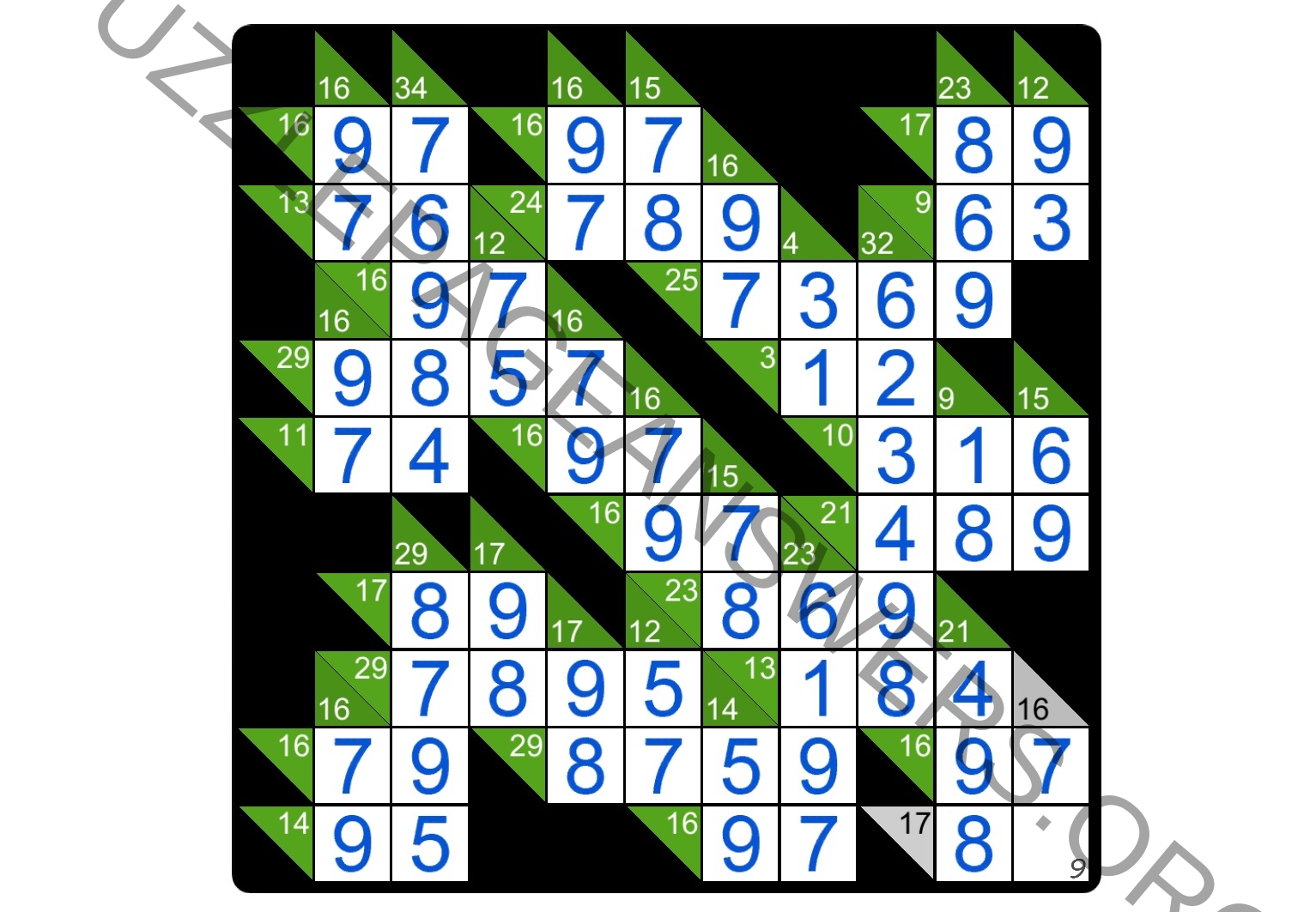 The task in Kakuro puzzles is to fill all the empty squares by using numbers from 1 to 9 so the sum of each horizontal block equals the clue on its left, and the sum of each vertical block equals the clue on its top. In addition, no number may be used in the same block more than once.