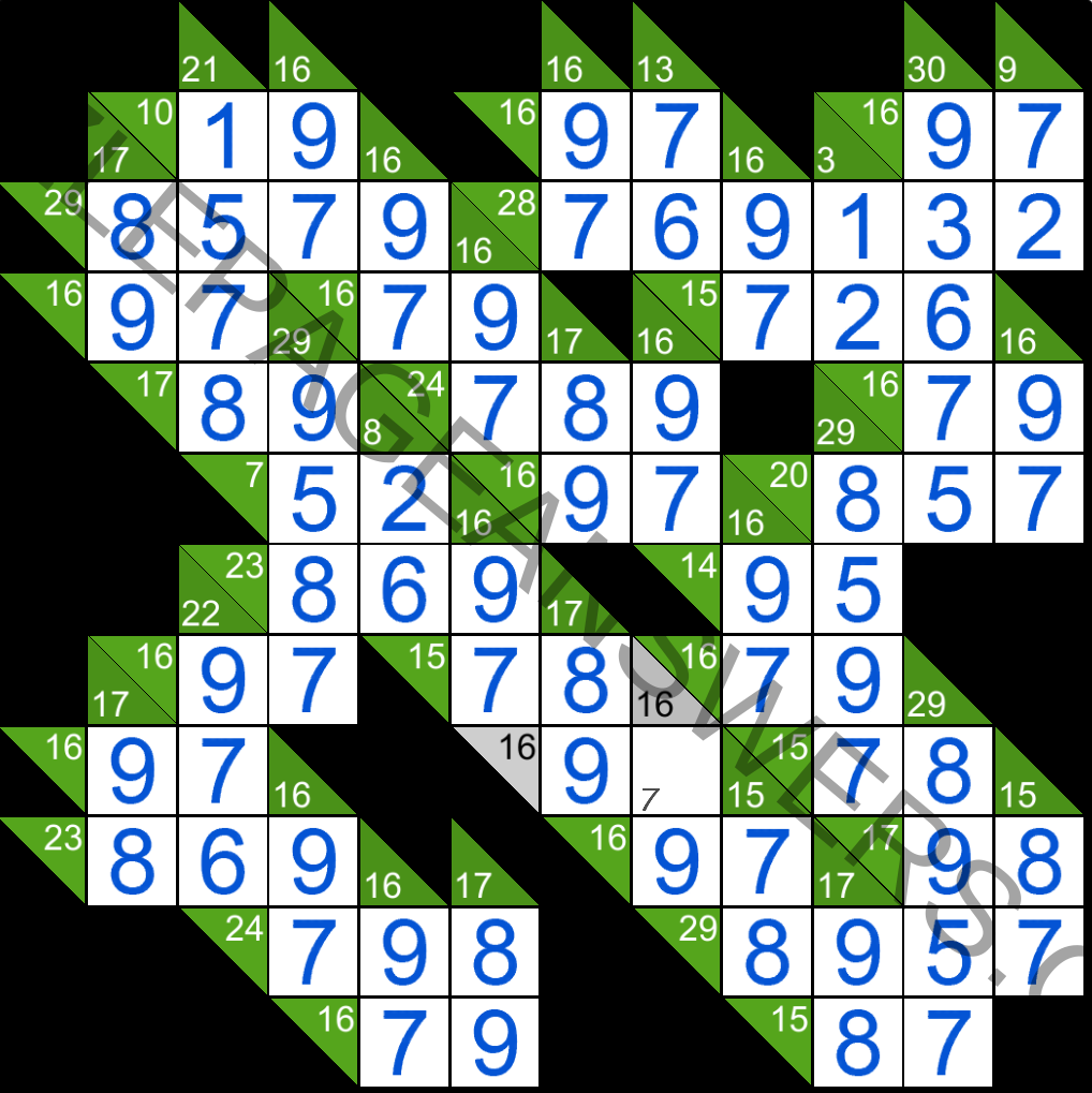 The task in Kakuro puzzles is to fill all the empty squares by using numbers from 1 to 9 so the sum of each horizontal block equals the clue on its left, and the sum of each vertical block equals the clue on its top. In addition, no number may be used in the same block more than once.