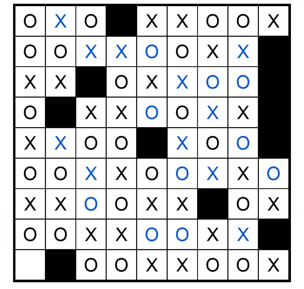 - Avoid three-in-a-row: Ensure that there are no three consecutive “X” or “O” symbols in any direction.