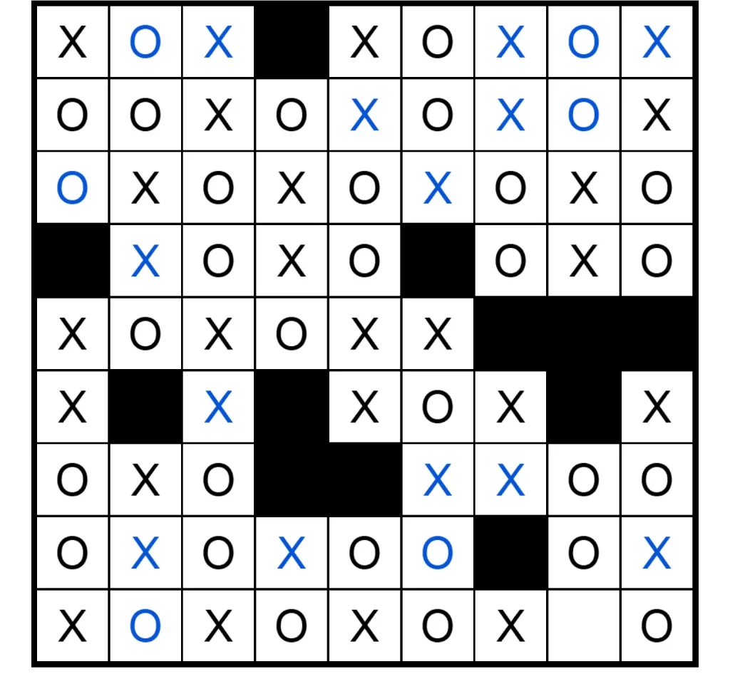 - Avoid three-in-a-row: Ensure that there are no three consecutive “X” or “O” symbols in any direction.