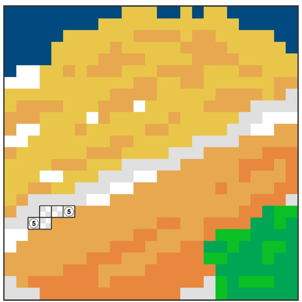 The object of this puzzle is to reveal the hidden picture by painting paths between pairs of the same number. In other words, for every clue, it is necessary to find another clue of the same value and join them together according to these criteria. Paths can be executed horizontally or vertically but they can’t cross other existing paths.